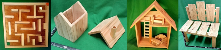 Ⓐビー玉迷路 500円 Ⓑ家型小物入れ 700円 Ⓒドールハウス 1500円 Ⓓ小型ベンチ 1500円