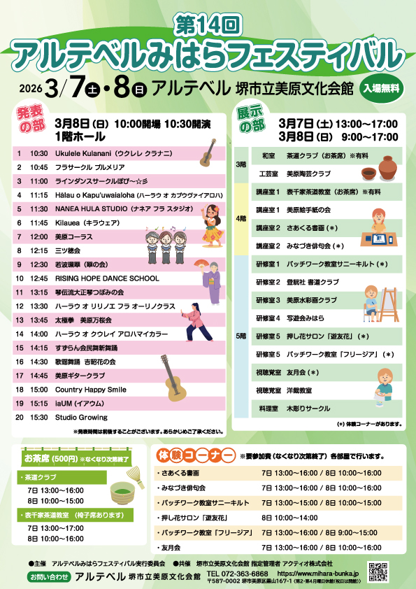 美原文化会館で活動している文化団体の発表会と展示会を行います。